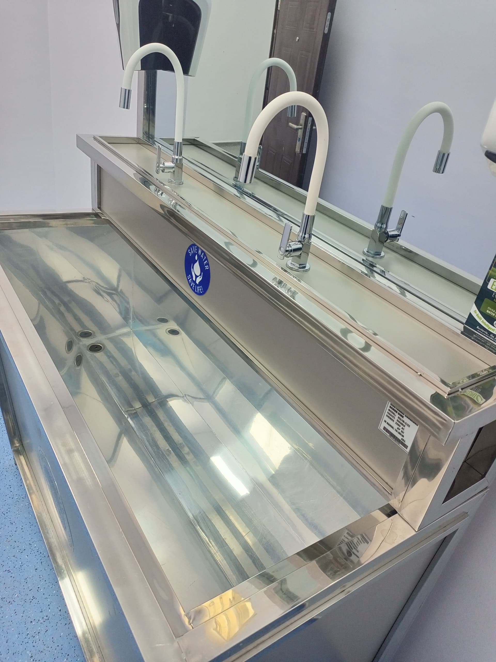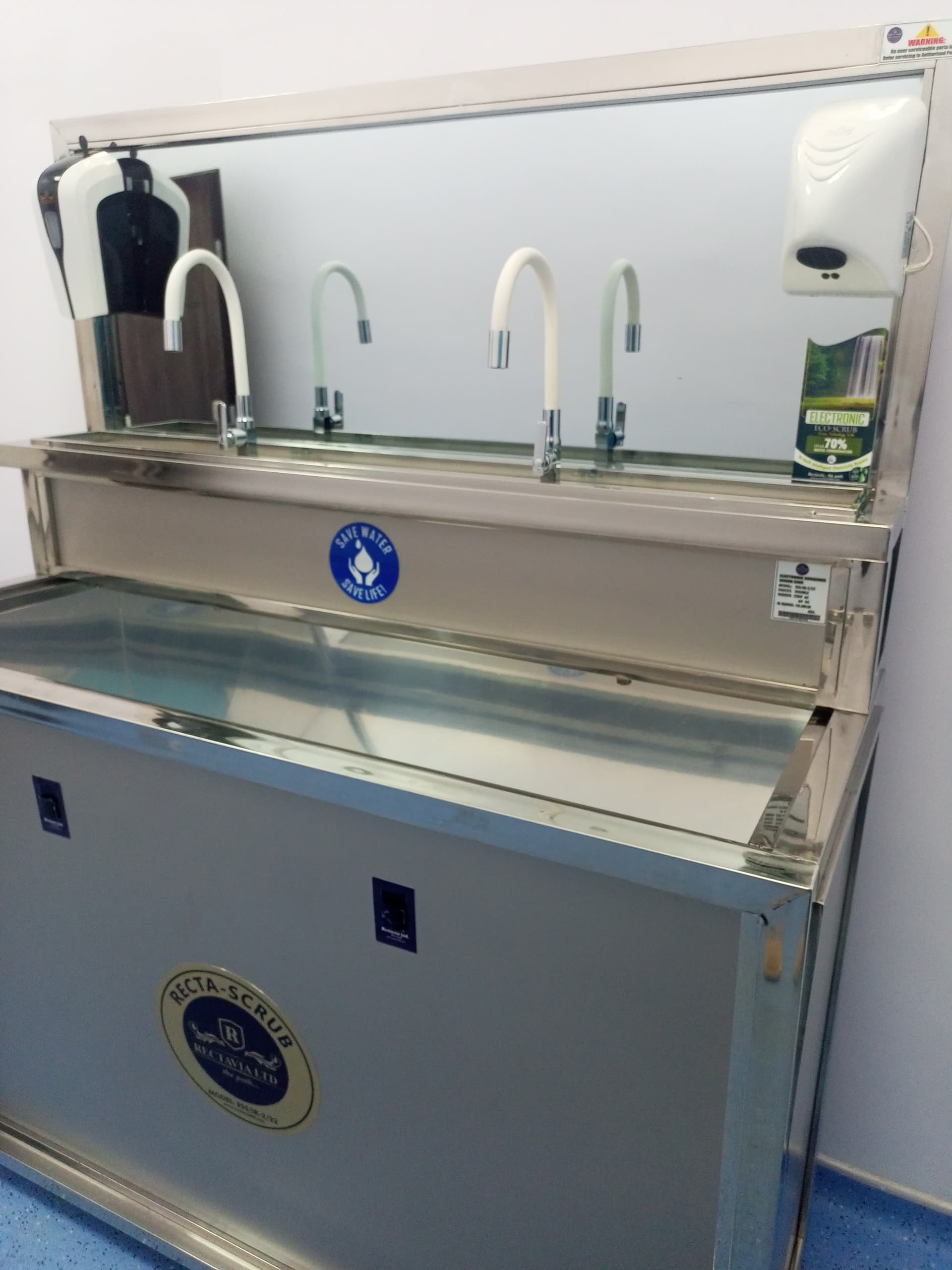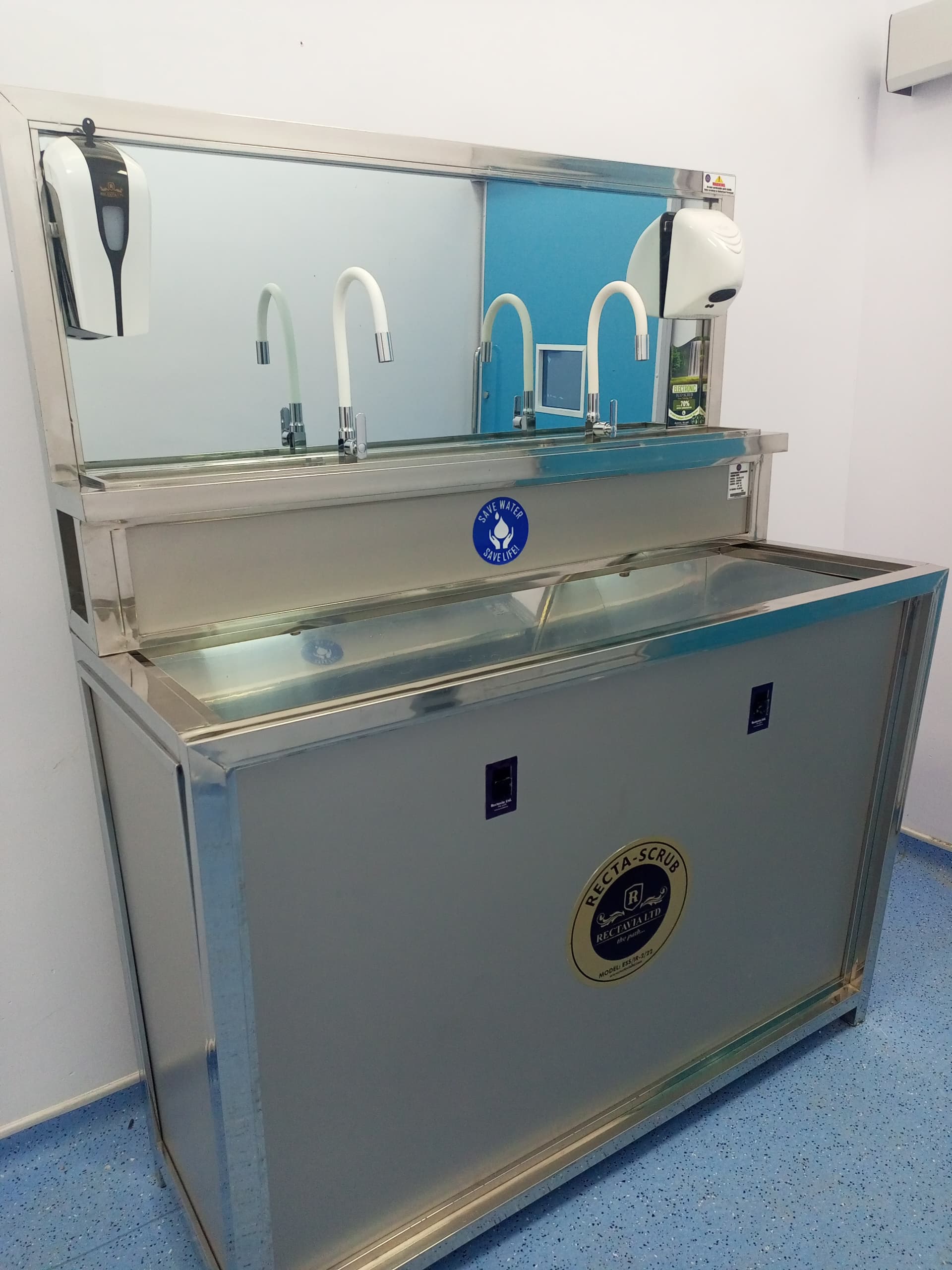 The Recta 2-Stationed Scrub Sink is a high-performance clinical sink designed for busy hospitals and surgical environments. It features two washing stations, infrared touchless water flow, dual foot pedals, and a built-in soap dispenser. With hot and cold water supply and a durable medical-grade stainless steel construction, it ensures efficient, hygienic, and comfortable handwashing while reducing the risk of cross-contamination.
